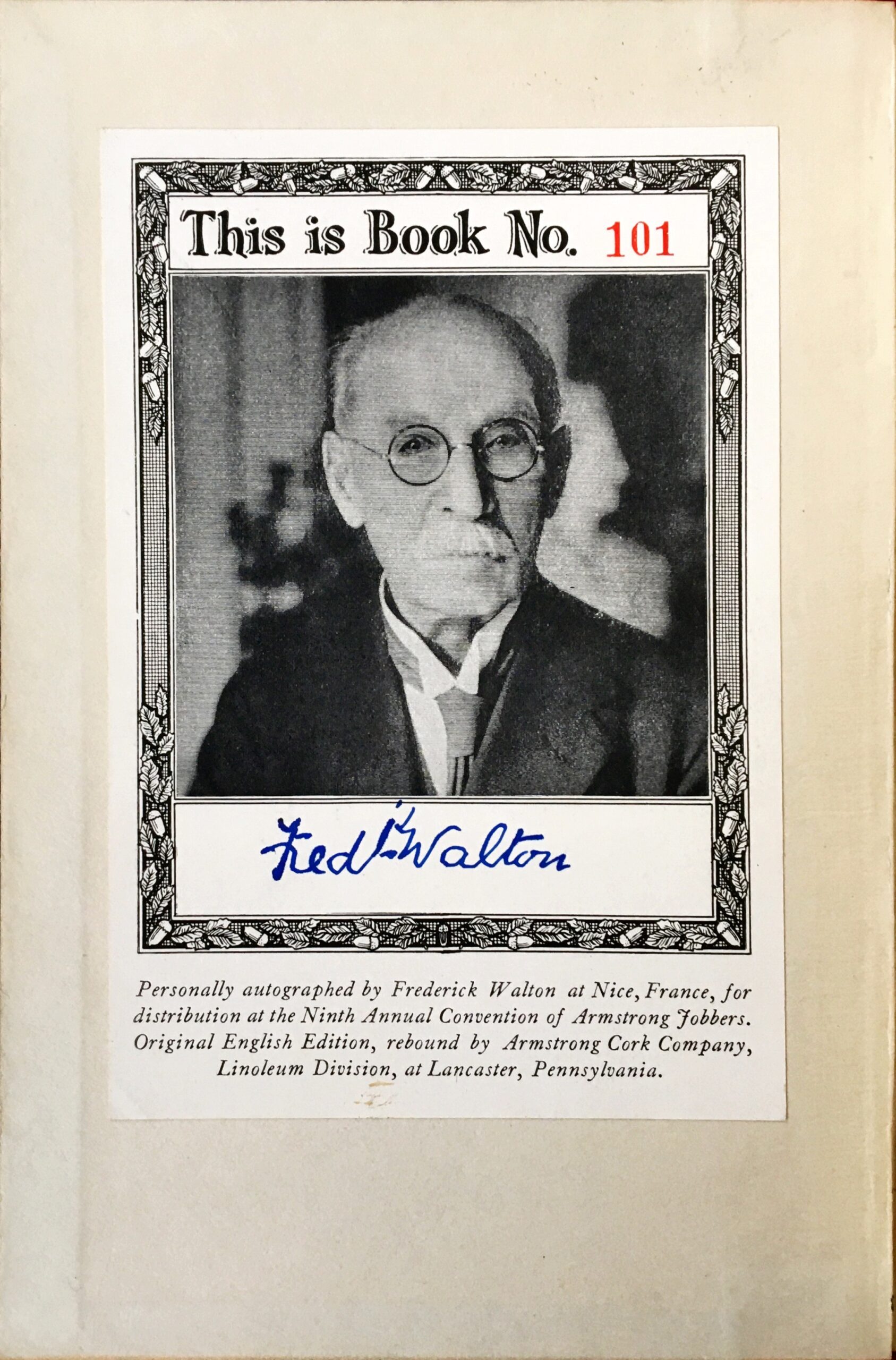 This first edition of the scarce work was rebound and distributed by the Armstrong Cork Company’s Linoleum division for the 9th Convention of Armstrong Jobbers, numbered and signed by Walton on its bookplate.