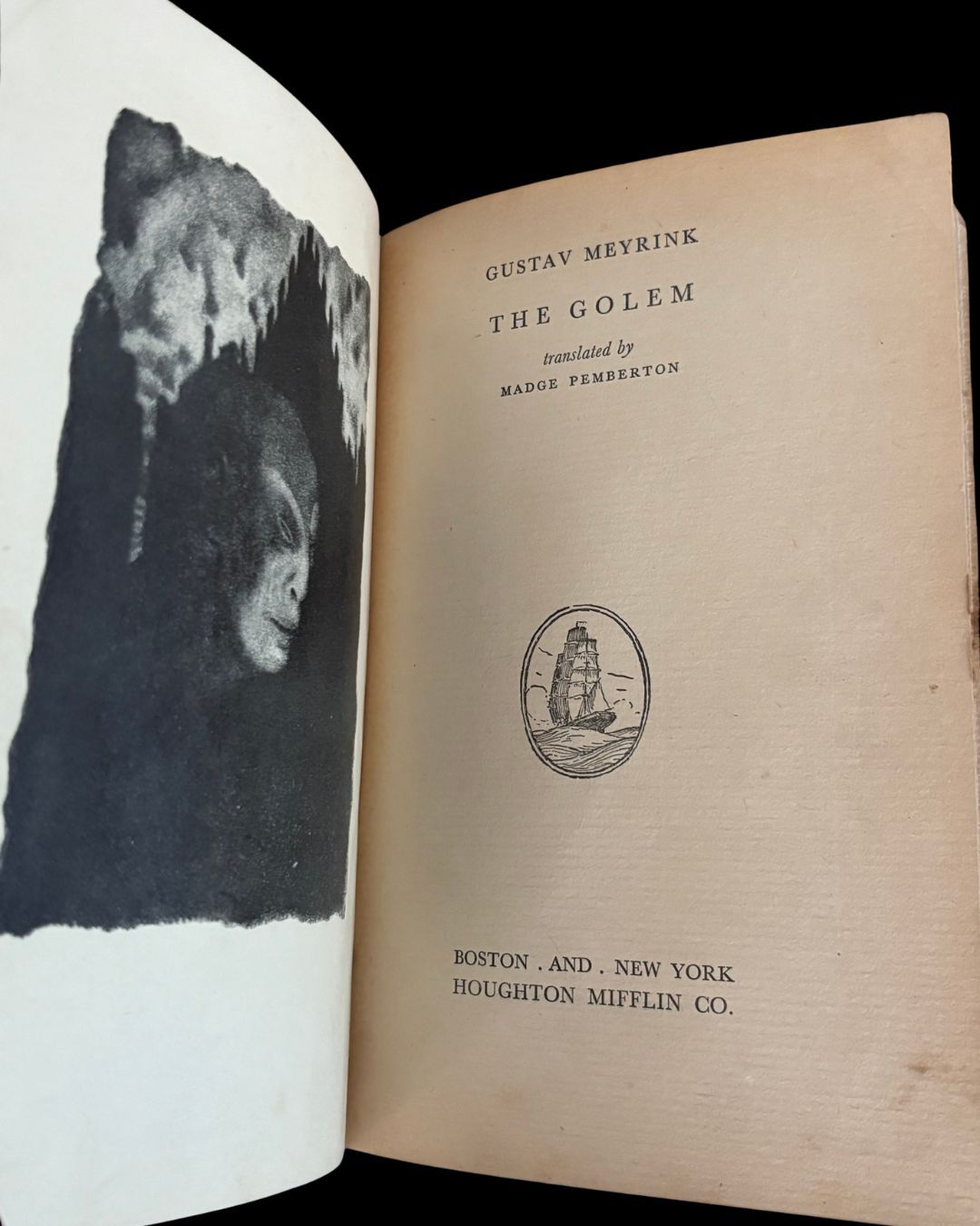 Meyrink, Gustav. Pemberton, Medge, trans. The Golem. Houghton Mifflin Co. Boston and New York. 1928. First American Edition.
