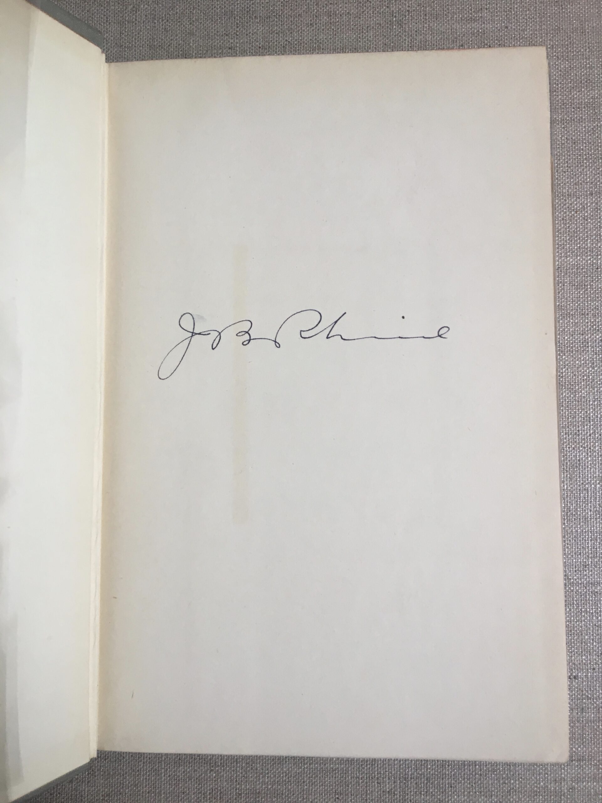 Signed first edition of Dr. J.B. Rhine’s pioneering work on parapsychological research, detailing his experiments into extrasensory perception, telepathy, and psychokinesis at Duke University. Formerly owned by late Illinois psychiatrist Dr. David Dean Brockman.